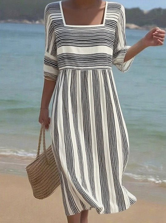 Elegantní šedé pruhované šaty se středně dlouhými rukávy a čtvercovým výstřihem