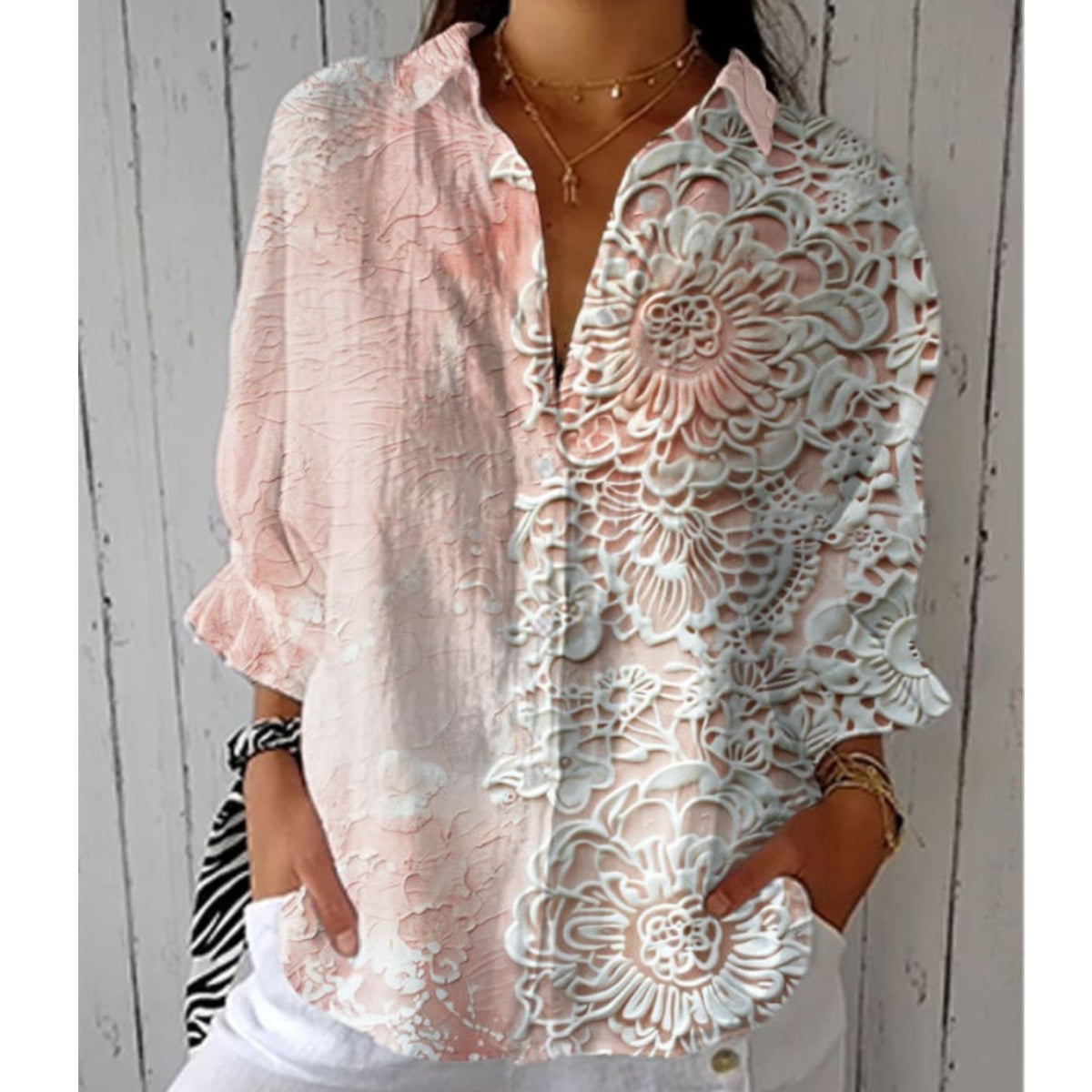 Bavlněná a lněná košile s dlouhým rukávem s růžovým a bílým květinovým vzorem
