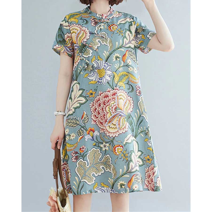 Dámské modré šaty s krátkým rukávem, krásným květinovým vzorem, stojáčkem a zapínáním na knoflíky