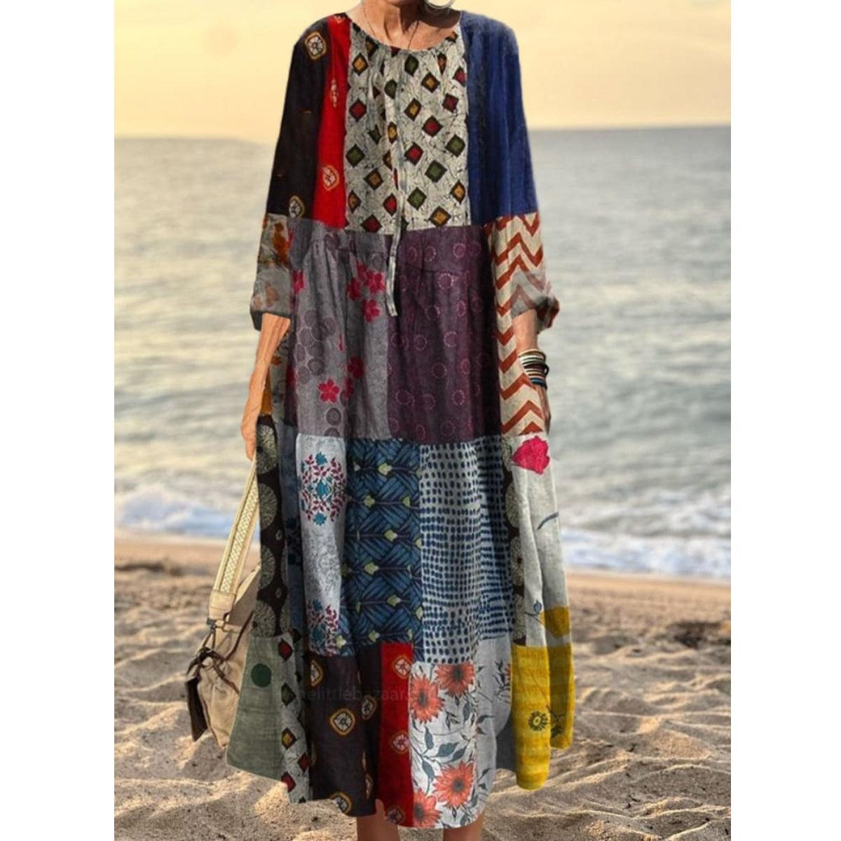 Dámské vintage patchworkové bavlněné šaty s kapsami a potiskem