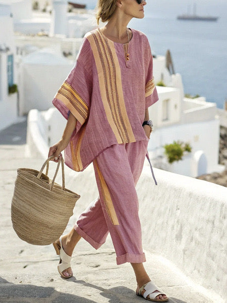 Dámský dvoudílný ležérní kostým v růžové barvě se žlutými pruhy, vyrobený z bavlny a lnu