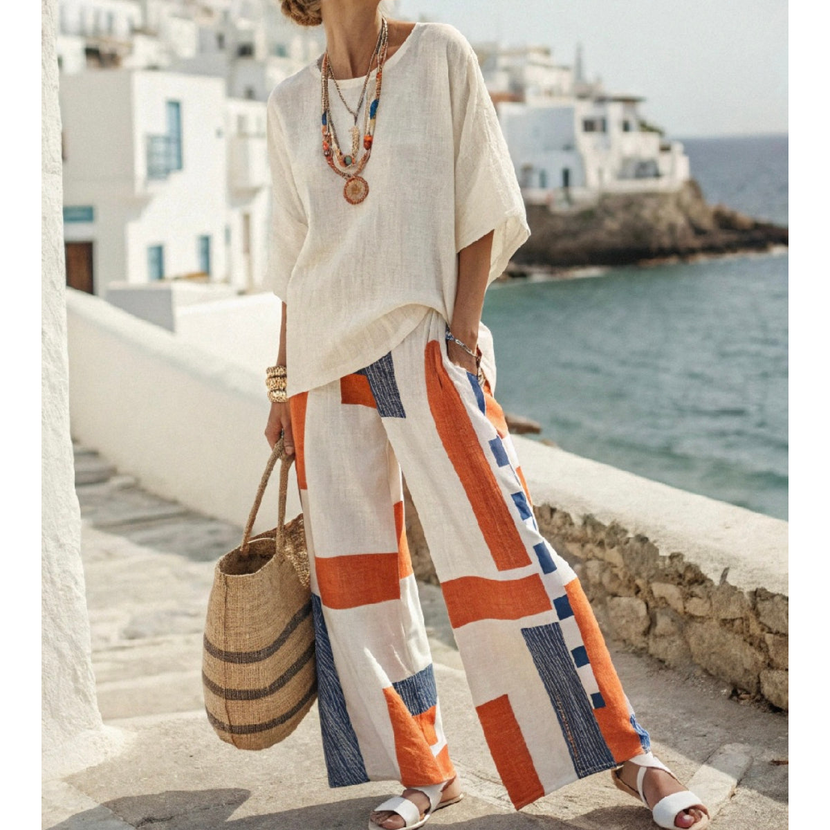 Dámský dvoudílný ležérní oblek z bílé bavlny a lnu s barevnými kalhotami s blokovým vzorem
