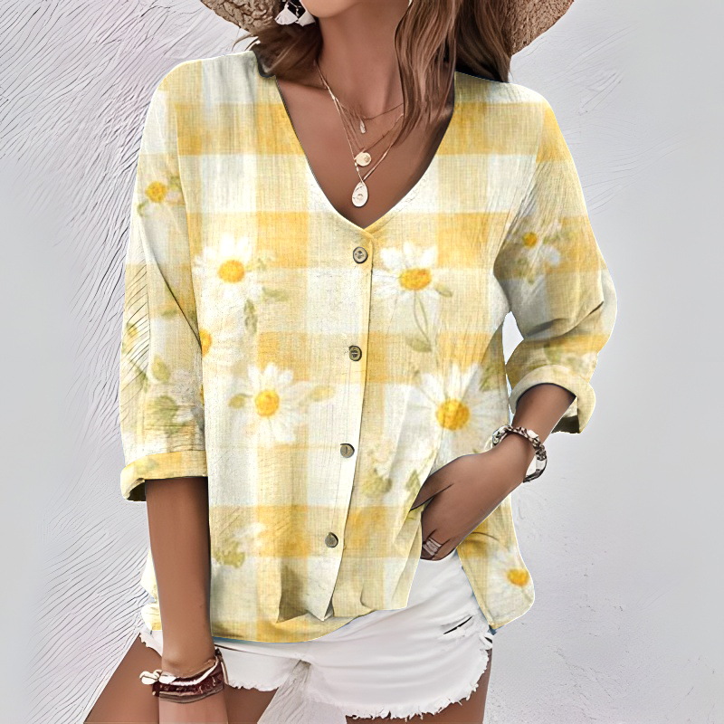 Elegantní a pohodlná žlutá košile s potiskem sedmikrásek, výstřihem do V, 3/4 rukávy a knoflíky