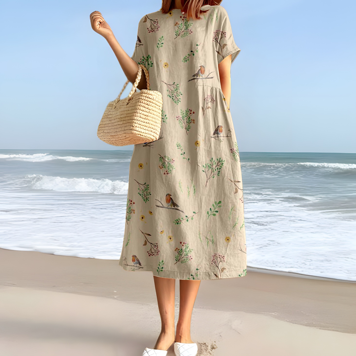Elegantní a pohodlné khaki šaty s větvemi stromů a potiskem ptáků