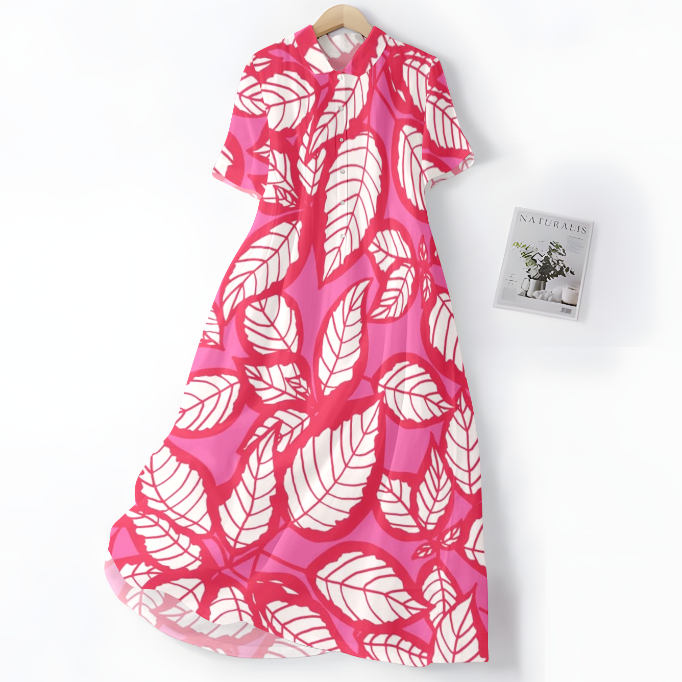 Elegantní a pohodlné růžové šaty s bílým listovým vzorem, košilovým límečkem a knoflíky