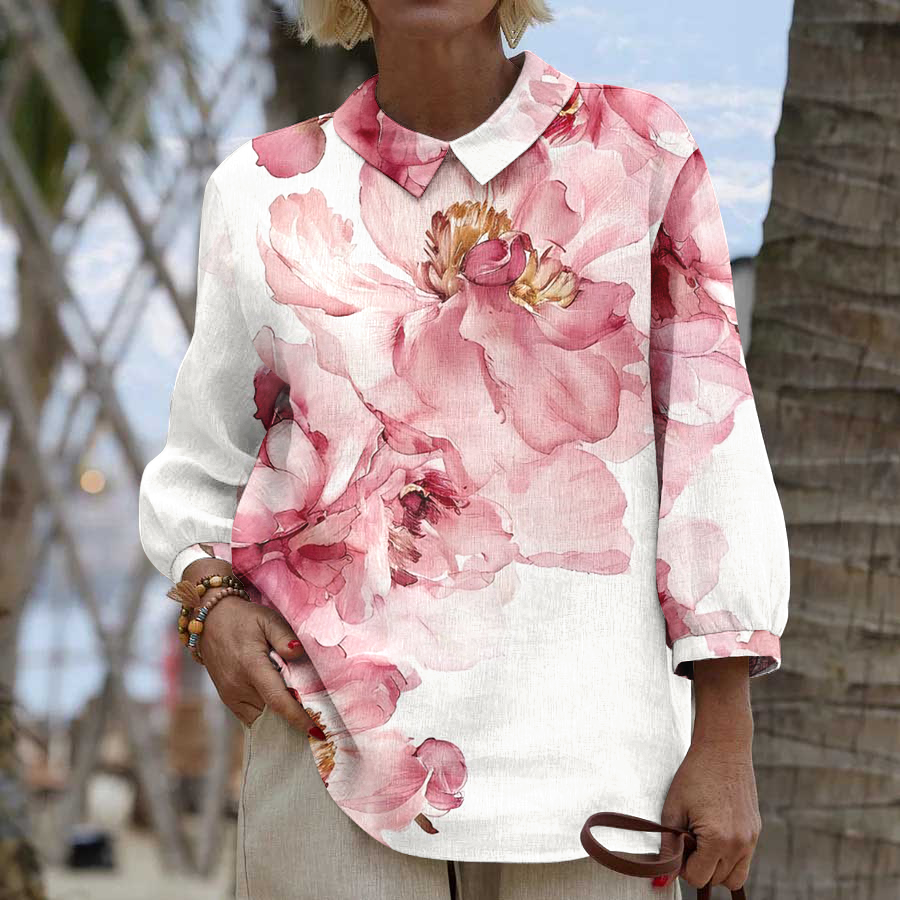 Pohodlná bílá košile s dlouhým rukávem z bavlny a lnu s krásným červeným květinovým vzorem