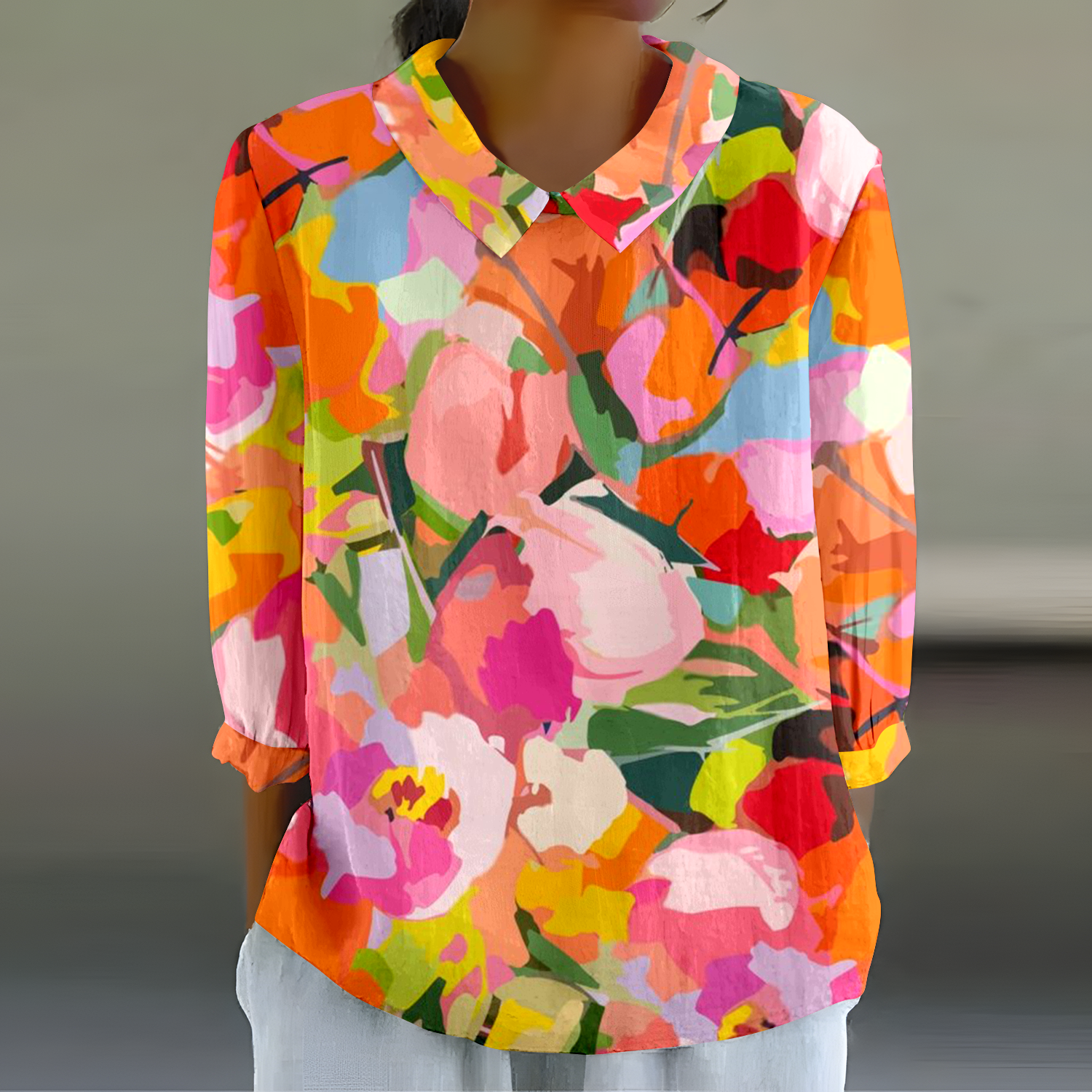 Pohodlná košile s dlouhým rukávem s oranžovým potiskem tulipánů
